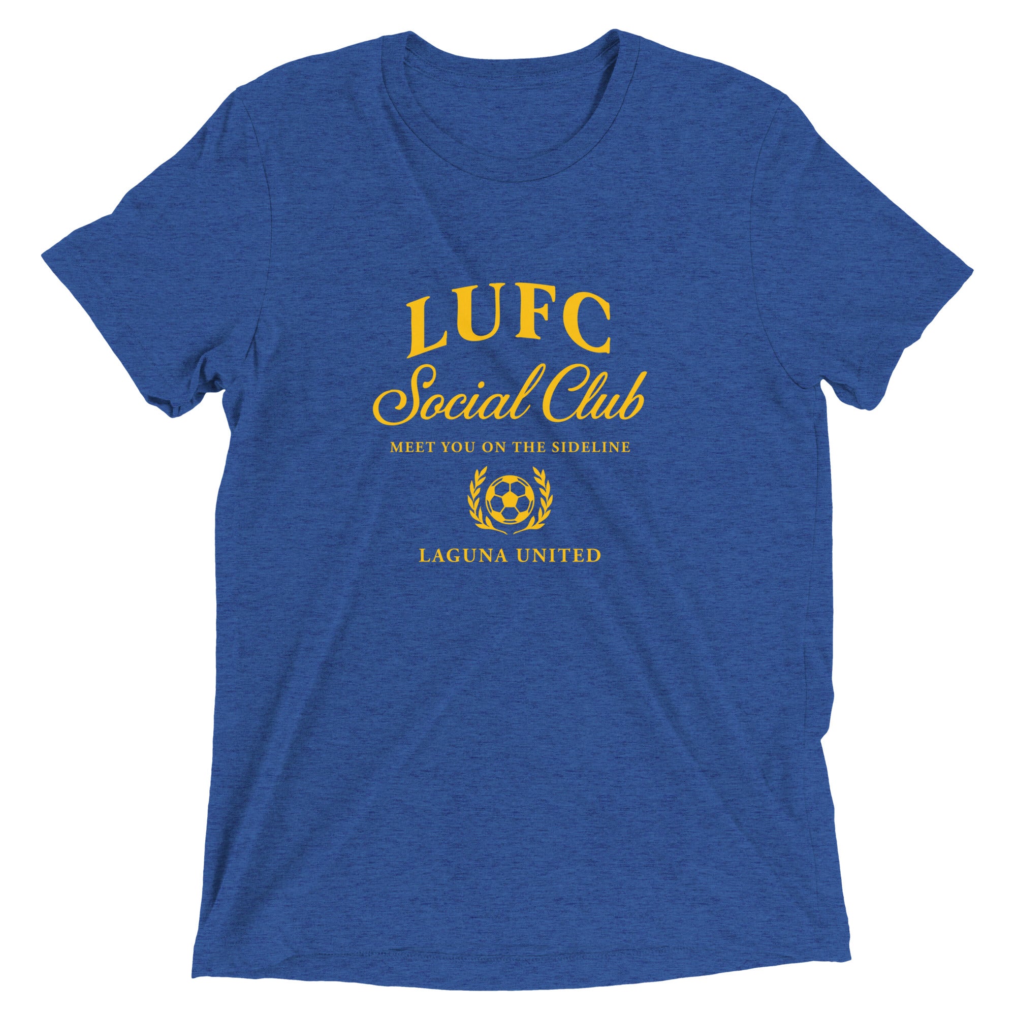 Bella + Canvas unisex tri-blend tee in royal blue with a bold yellow print. Lightweight with a vintage drape, soft from day one, and made to hold its shape.